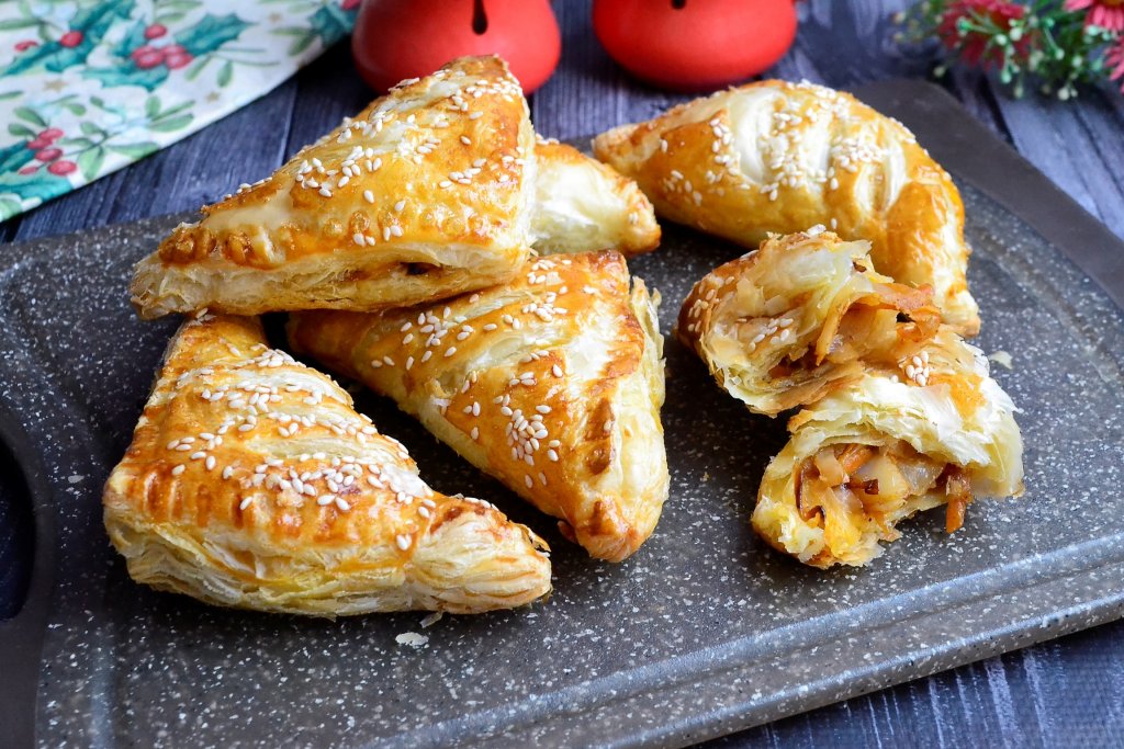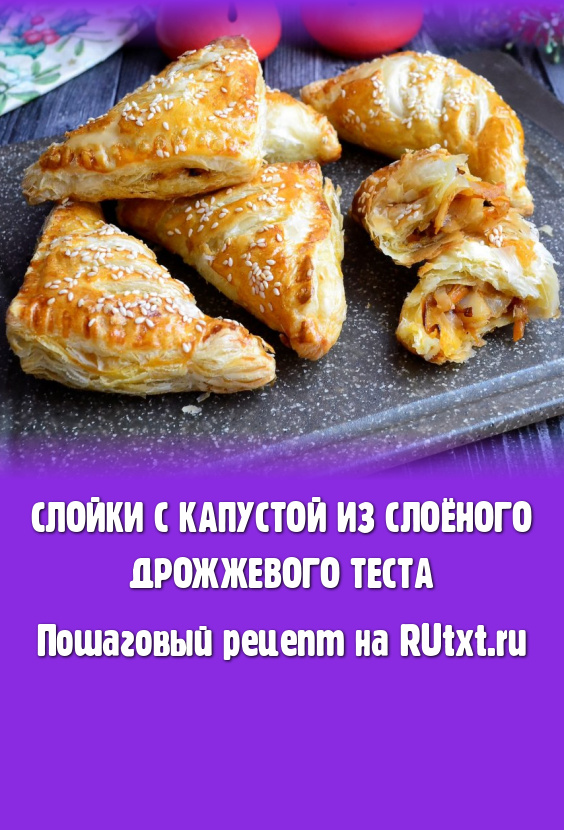 Очень вкусные, хрустящие, нежные слойки с капустой, испечённые из слоёного дрожжевого теста, подавать в тёплом виде.