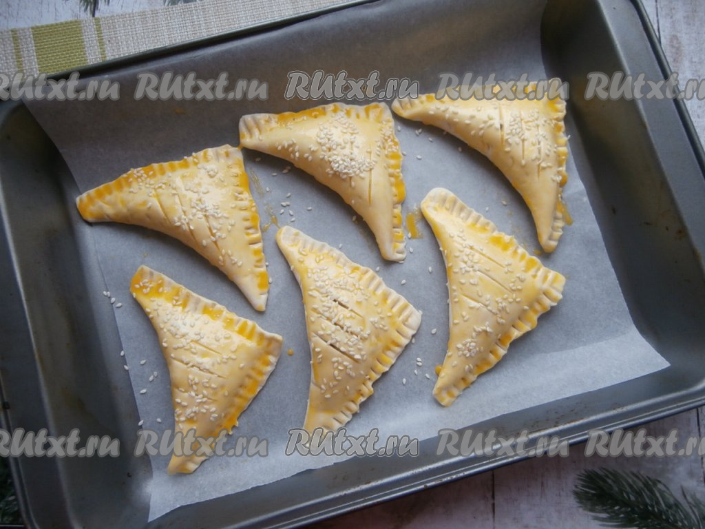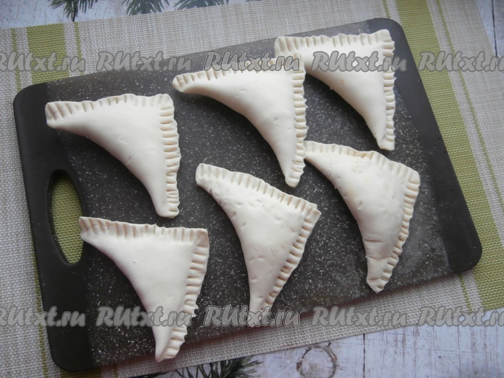 Сложить слойки треугольниками, соединяя противоположные углы и хорошенько придавливая края (можно для этого воспользоваться вилкой). Переложить слоечки на застеленный пергаментной бумагой противень.