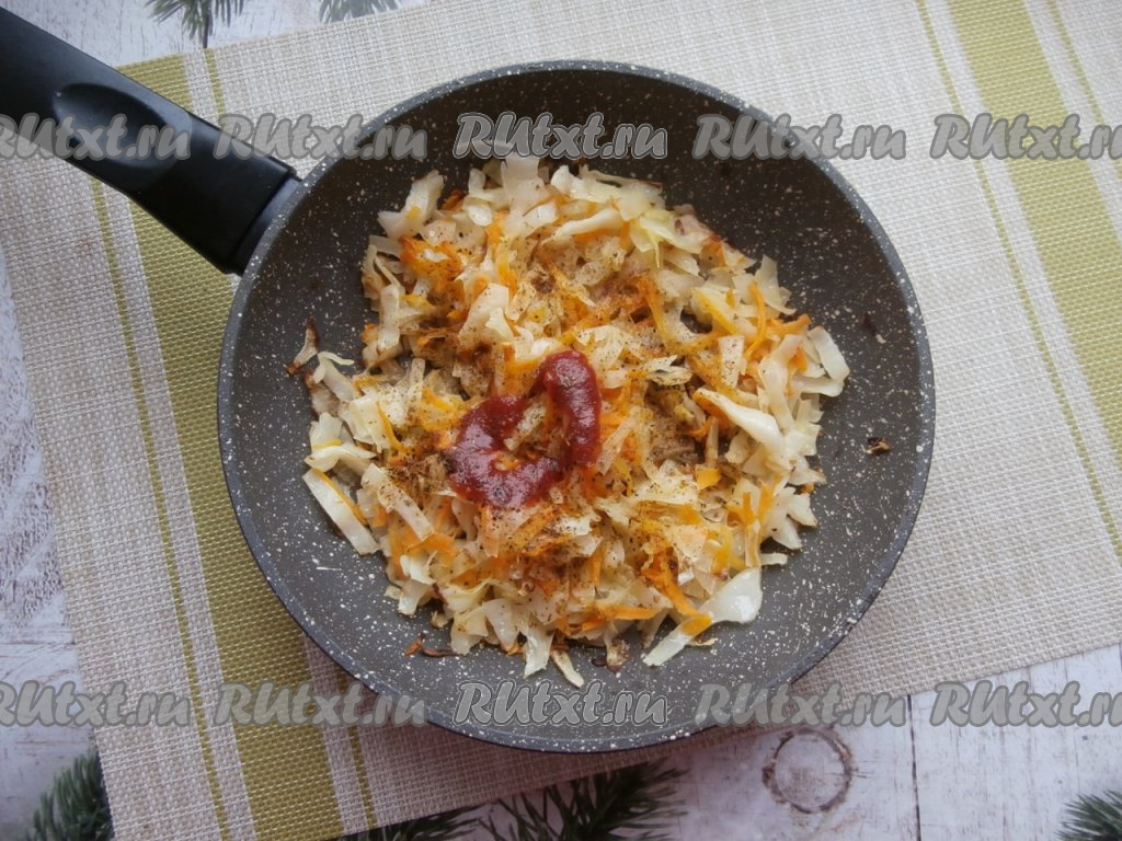 Влить 2 столовые ложки воды и обжарить, помешивая, на среднем огне минут 5. Далее добавить соль, специи, томатный соус, сахар, поперчить, перемешать и протушить приблизительно 10 минут на слабом огне, иногда помешивая. Готовую капусту остудить.