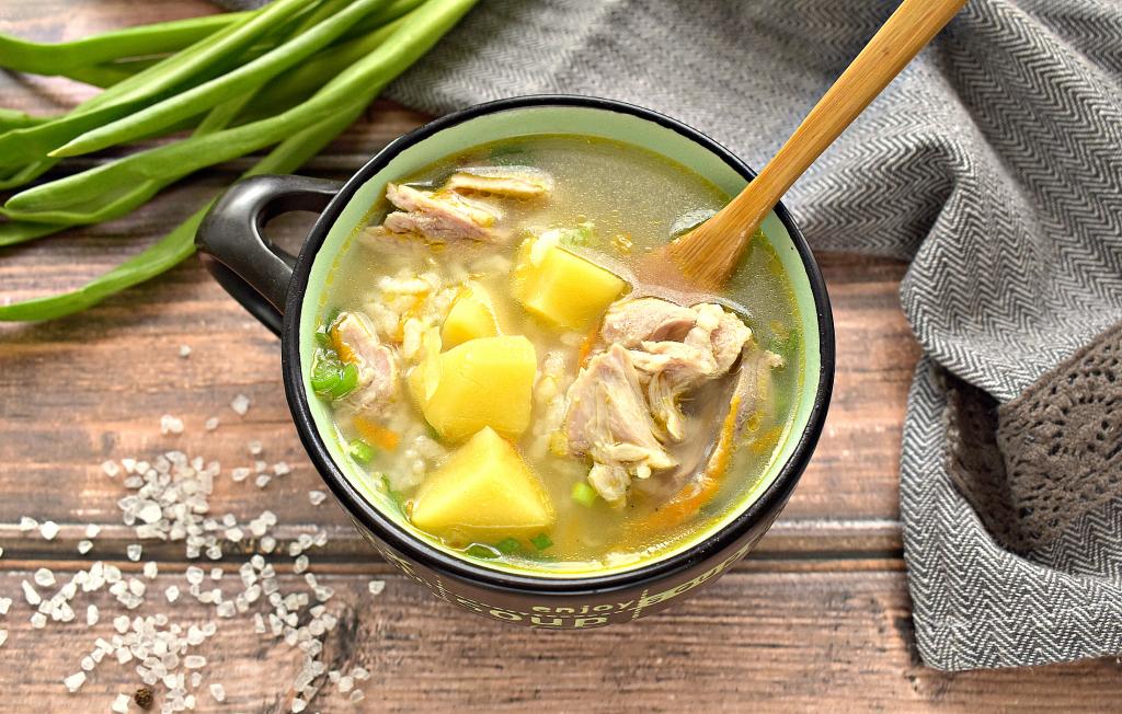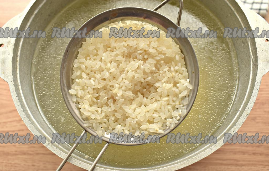 Промываем рис, откидываем его на сито, чтобы лишняя жидкость слилась. После того как картофель проварится в закипевшем бульоне 5 минут, добавляем рис, варим 20 минут.