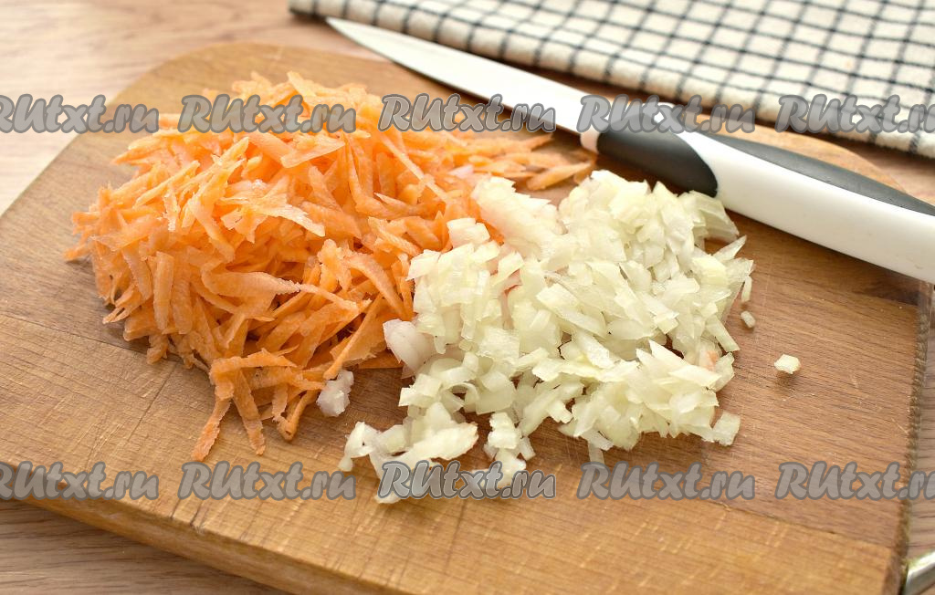 Лук нарезаем достаточно мелко, натираем морковку на средней тёрке.