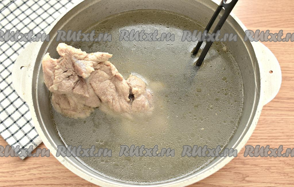 Промываем свинину, перекладываем в кастрюлю, вливаем 2 литра холодной воды. Кастрюлю ставим на сильный огонь, после закипания бульона снимаем пену и, убавив огонь, варим свинину до полной готовности. У меня варилось мясо 1 час 10 минут. Варёную свинину извлекаем из кастрюли, оставляем мясо до остывания. Получившийся мясной бульон на свой вкус солим.