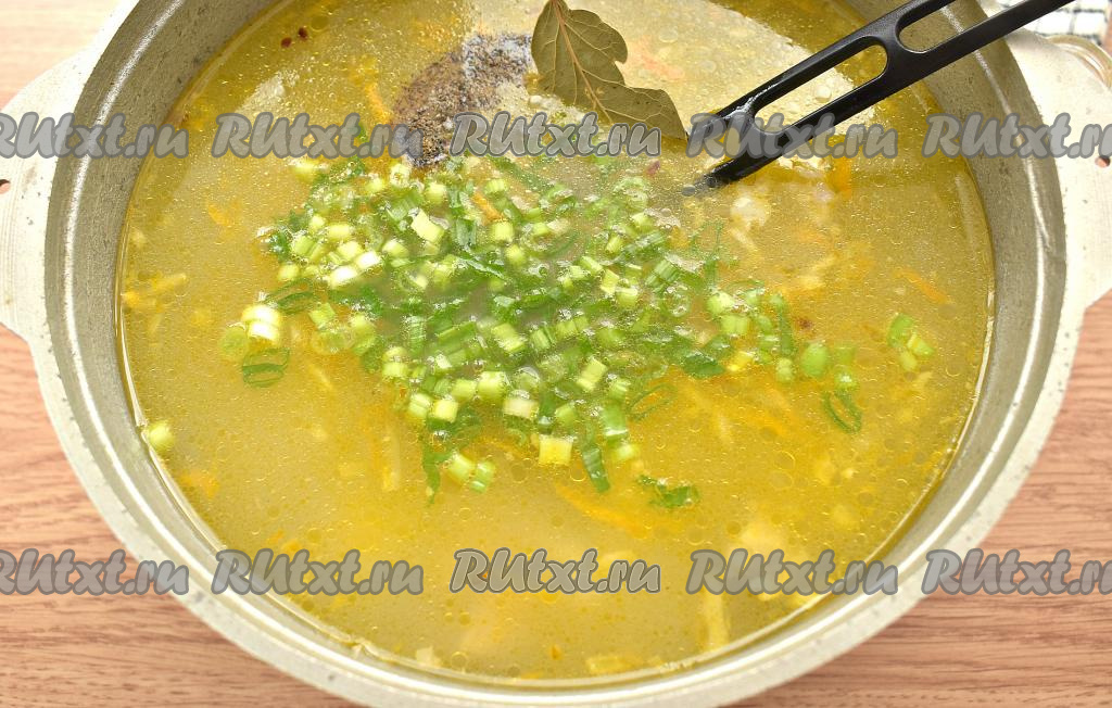 В конце приготовления добавляем в суп измельчённую зелень, лавровый лист, перчим на свой вкус, снова доводим до кипения, провариваем 2-3 минуты и выключаем огонь.
