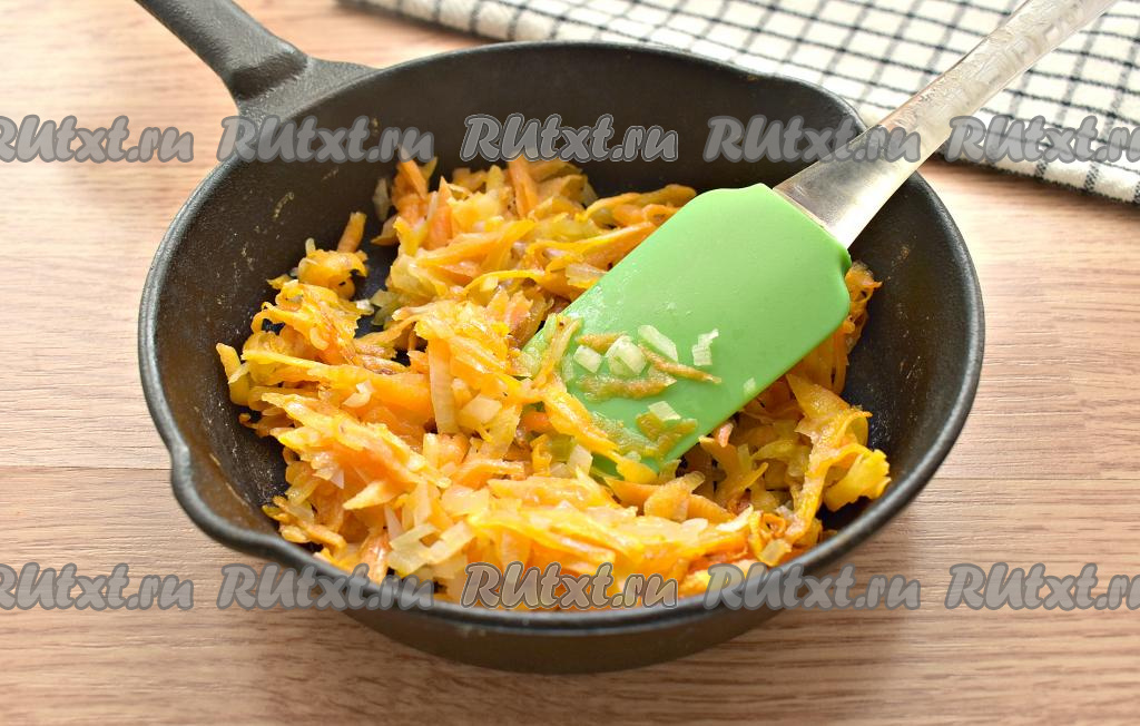 Хорошо прогреваем растительное масло в сковороде, выкладываем морковку с луком и на среднем огне обжариваем их минут 5-7, периодически перемешивая. Овощи должны стать мягкими.