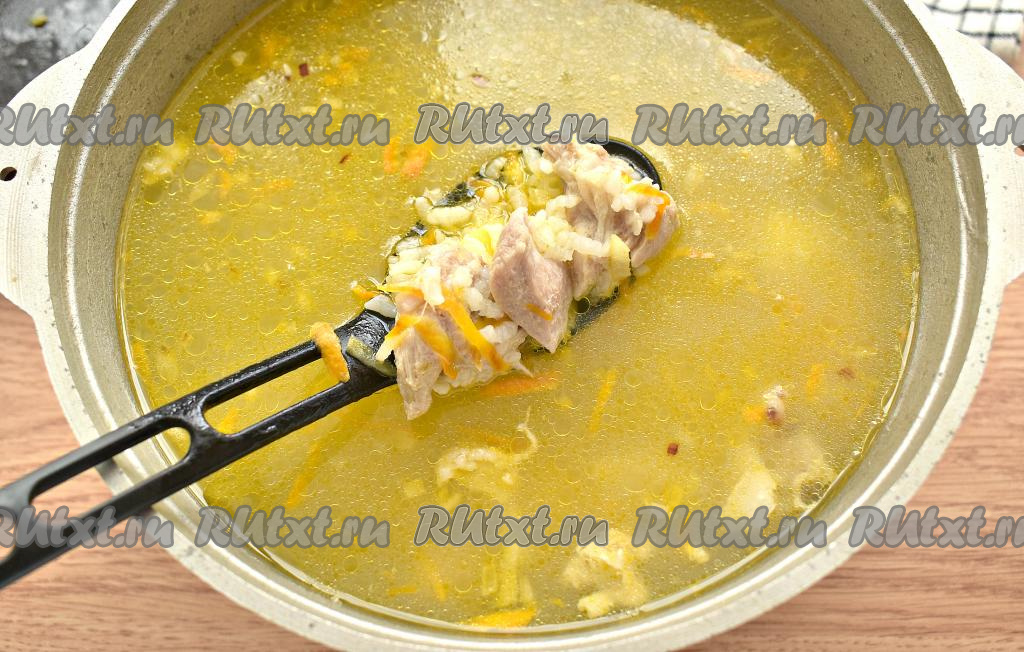 Остывшую свинину отделяем от костей, нарезаем на кусочки. После того как картошка с рисом проварятся вместе минут 20, добавляем в кастрюлю кусочки свинины и обжаренные овощи. Доводим рисовый суп до кипения и, убавив огонь, провариваем минут 5.