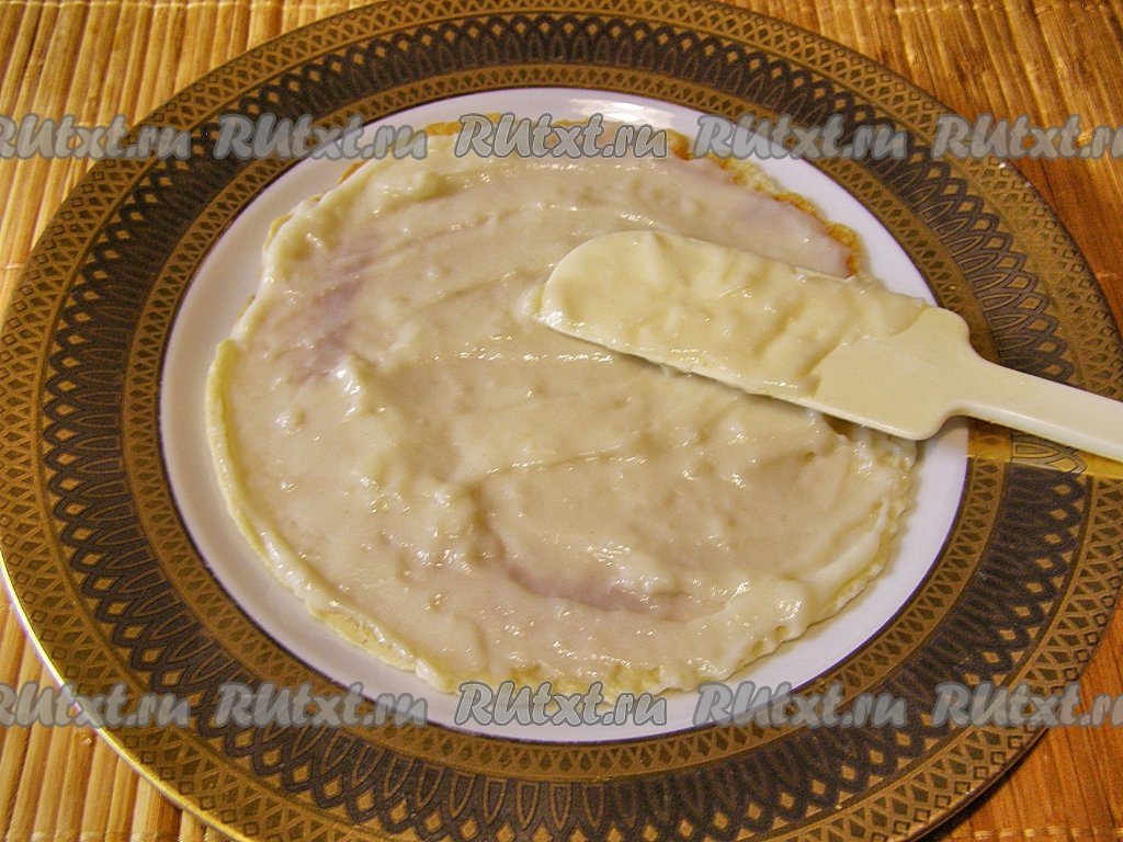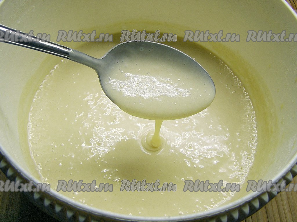 Тесто должно получиться достаточно жидким, немного гуще, чем тесто для блинов.