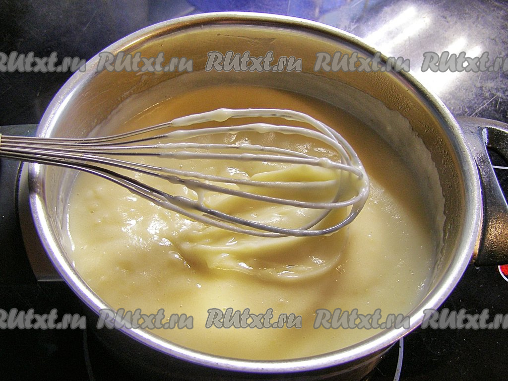 Ставим кастрюлю на средний огонь и нагреваем, постоянно перемешивая, чтобы смесь не пригорала. После того как смесь закипит, варим крем, не переставая помешивать, ещё, примерно, 5 минут (до загустения), затем снимаем с огня.
