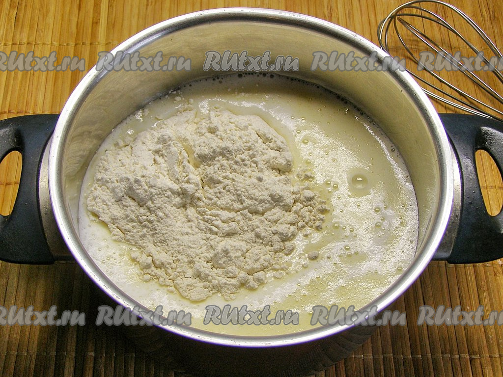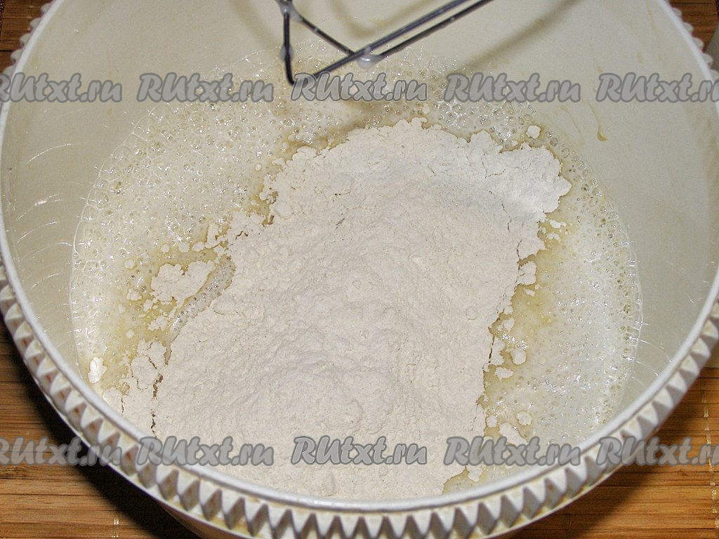 Всыпаем в смесь муку, снова хорошо перемешиваем, чтобы тесто стало однородным и не было комочков.