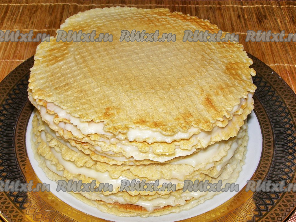 Таким образом, смазывая каждый вафельный корж кремом и выкладывая их друг на друга, собираем весь торт. Верхний корж можно не смазывать заварным кремом или смазать тонким слоем. Убираем вафельный торт в холодильник минимум на 5-6 часов, чтобы вафли пропитались кремом.
