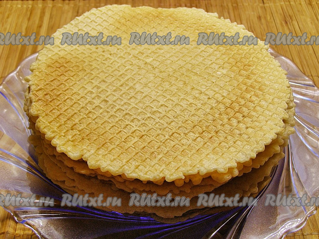Готовую вафлю с помощью лопаточки перекладываем на плоскую тарелку. Постепенно выпекаем все вафли, складывая их одна на другую на тарелку. Из данного количества теста получается 18-20 вафель. Даём вафлям остыть.