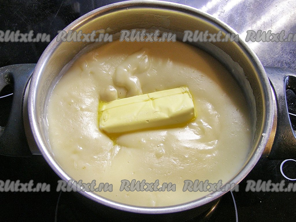 Кладём в горячий крем кусочек сливочного масла и ещё раз хорошо перемешиваем, пока масло не растает. Оставляем крем остывать. Периодически его надо перемешивать, чтобы на поверхности не образовывалась корочка.