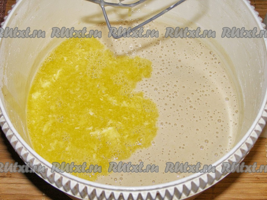 Добавляем растопленное на плите (или в микроволновке) негорячее сливочное масло в получившееся тесто, снова перемешиваем.