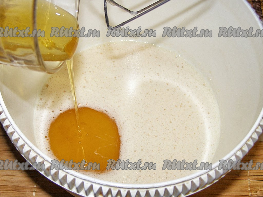 Вливаем в яично-сахарную смесь жидкий мёд. Если у вас мёд засахарился, его нужно заранее прогреть на водяной бане и остудить до комнатной температуры. Ещё раз хорошо перемешиваем.