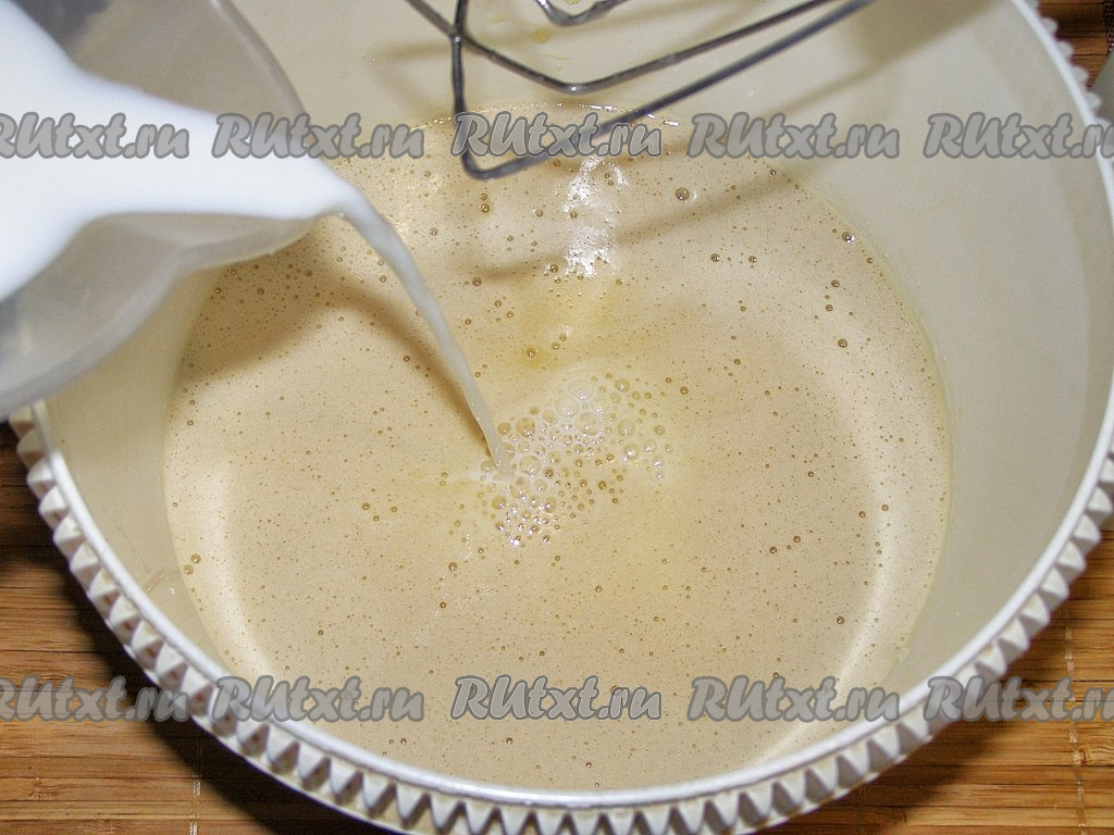 Вливаем в смесь яиц, сахара и мёда молоко и продолжаем перемешивать.