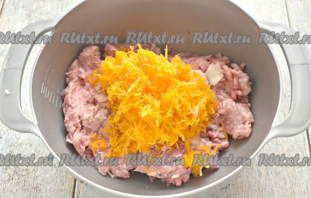 80 грамм тыквы, очищенной от семечек и кожуры, натираем на мелкой тёрке и тоже добавляем к фаршу.