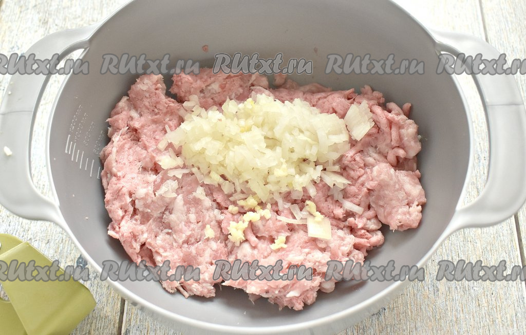 Фарш можно взять и покупной, и приготовленный в домашних условиях. Я предпочитаю готовить фарш самостоятельно, пропуская через мясорубку кусочки мяса (в этот раз я сделала фарш из свинины и говядины). В миску перекладываем мясной фарш. Половину очищенной луковицы мелко нарезаем и вместе с пропущенным через пресс чесноком добавляем к фаршу.