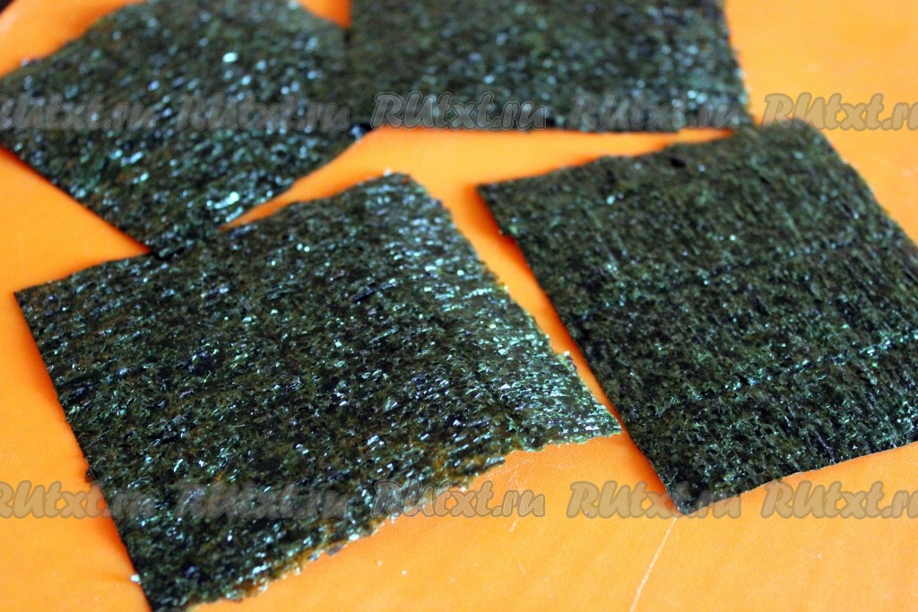 Лист нори разрежьте на 4 квадрата.