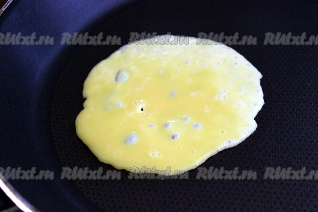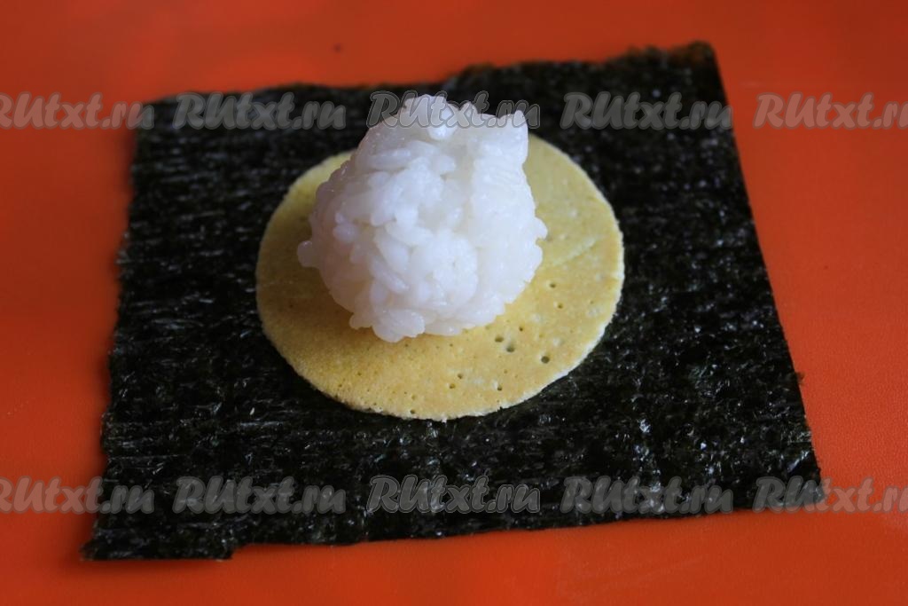 На квадратный лист нори на его матовую сторону уложите яичный блинчик и на него порцию риса.