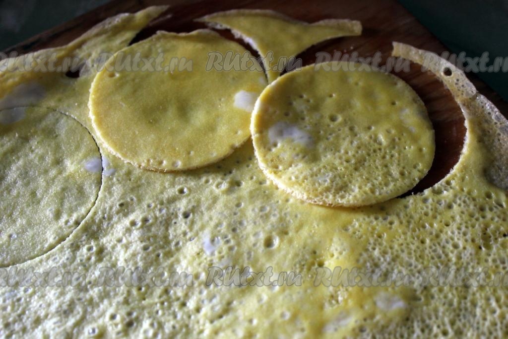 Яйца или желтки взбейте с водой и солью и пожарьте тонкие небольшие порционные блинчики или один яичный блинчик, из которого потом можно вырезать кружочки, а остатки - обрезки использовать для других суши и роллов.