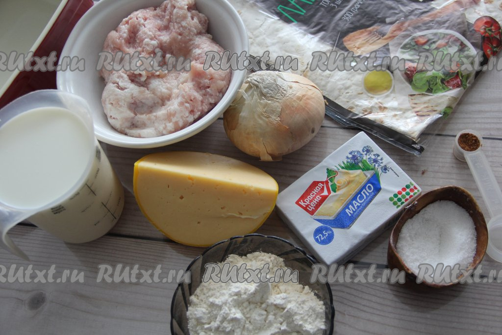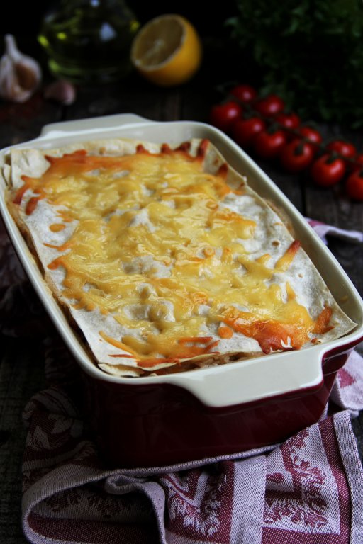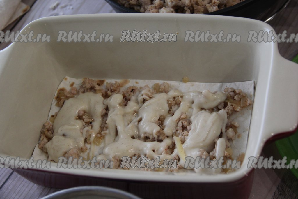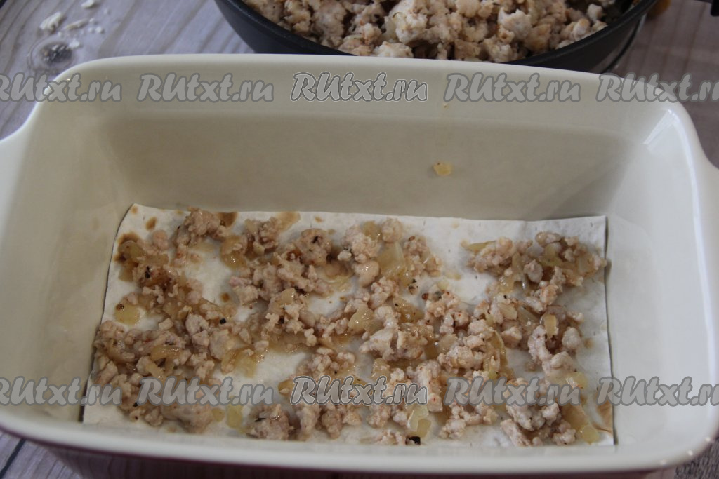 Когда соус бешамель немного остынет, можно приступать к формированию лазаньи. Тонкий лаваш нарезать на листы по размеру вашей формы для запекания. На дно формы выложить лист лаваша, распределить сверху часть обжаренного фарша.