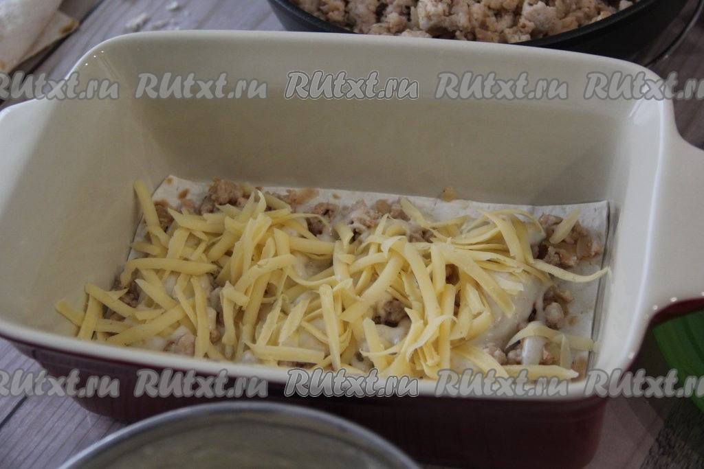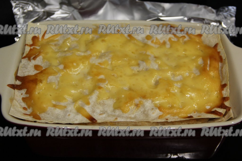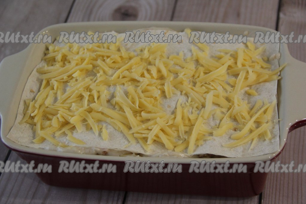 Накрыть начинку следующим листом лаваша и слегка прижать, повторить слои, собирая постепенно всю лазанью. Верхним слоем должен быть лист лаваша, присыпать его натёртым сыром.
