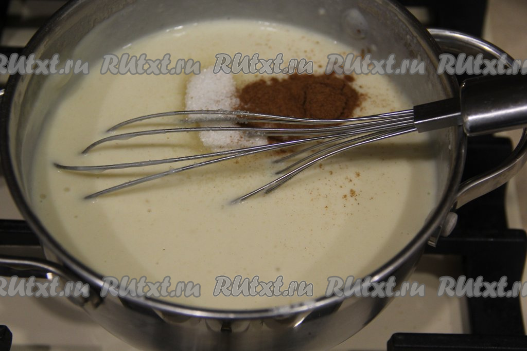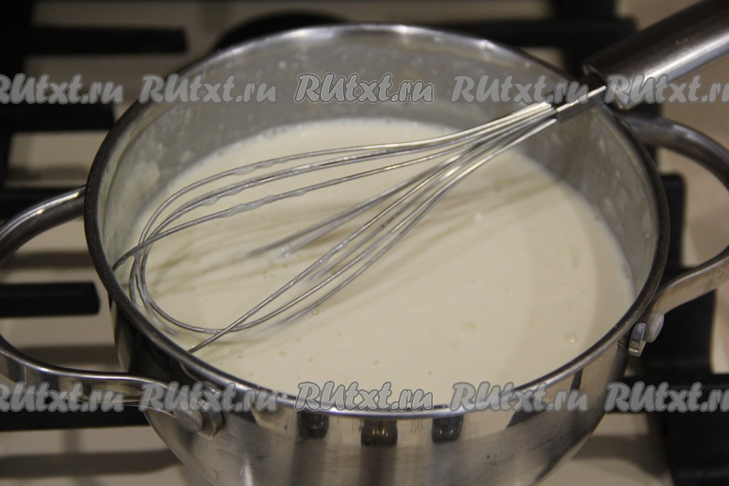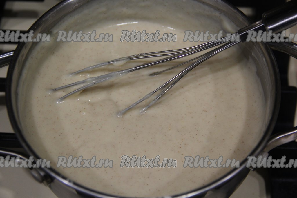 Снять соус бешамель с огня, он получится в меру густым, ровным и однородным, дать ему немного остыть.