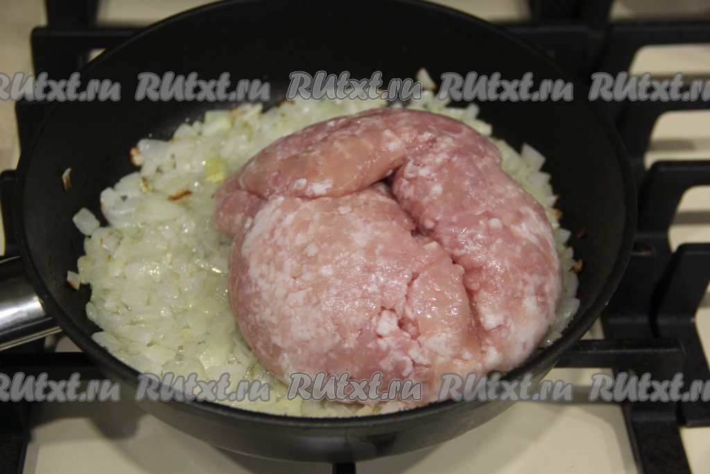 К обжаренному луку добавить фарш, обжаривать до готовности мяса (я обжаривала минут 15). Во время жарки нужно тщательно перемешивать и разбивать комочки фарша, в конце посолить, убрать с огня и дать немного остыть.