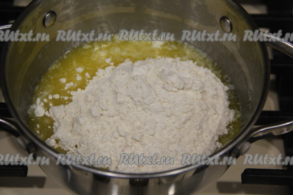 Приготовить соус бешамель, для этого в небольшую кастрюлю (или в сотейник) выложить сливочное масло и растопить его на среднем огне. Не снимая кастрюлю с огня, добавить муку в масляную массу.