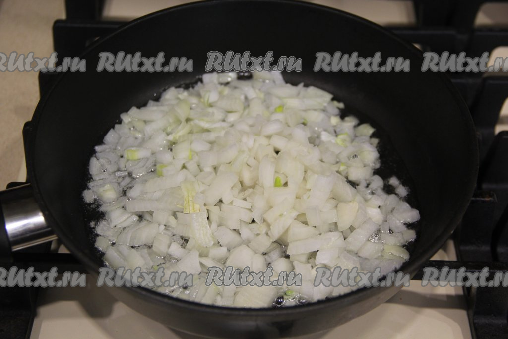 Почистить, мелко нарезать луковицу и выложить в сковороду с растительным маслом. Обжаривать лук до золотистого цвета (минуты 3-4), помешивая, на среднем огне.