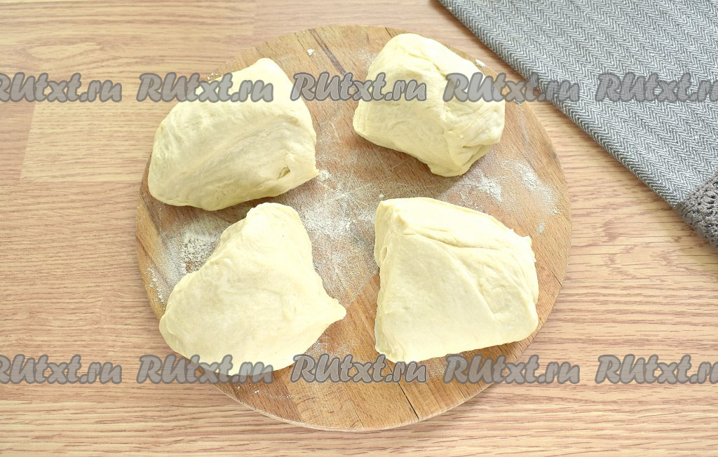 Поднявшееся тесто обминаем, делим на 4 куска.