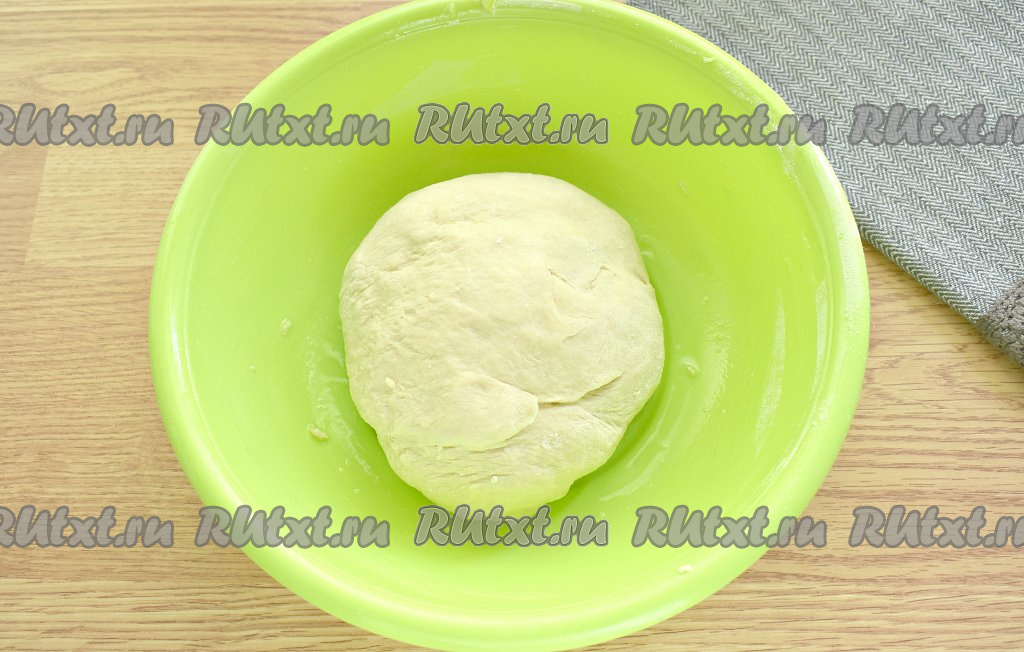 Замешиваем тесто. Сначала ингредиенты смешиваем ложкой в миске, а потом продолжаем замес дрожжевого теста уже на столе. В процессе замешивания добавляем оставшуюся часть муки. Месим тесто для пышек не менее 10 минут на столе. Тесто должно получиться мягким, эластичным. Не нужно забивать тесто мукой. Получившееся тесто перекладываем в миску, затем прикрываем полотенцем и ставим в тёплое место, примерно, на час (или чуть больше). Тесто должно увеличиться в объёме раза в 2.