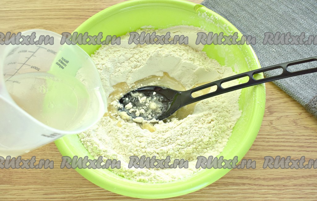 Получившуюся смесь вливаем в центр мучной воронки, сразу начинаем перемешивать.