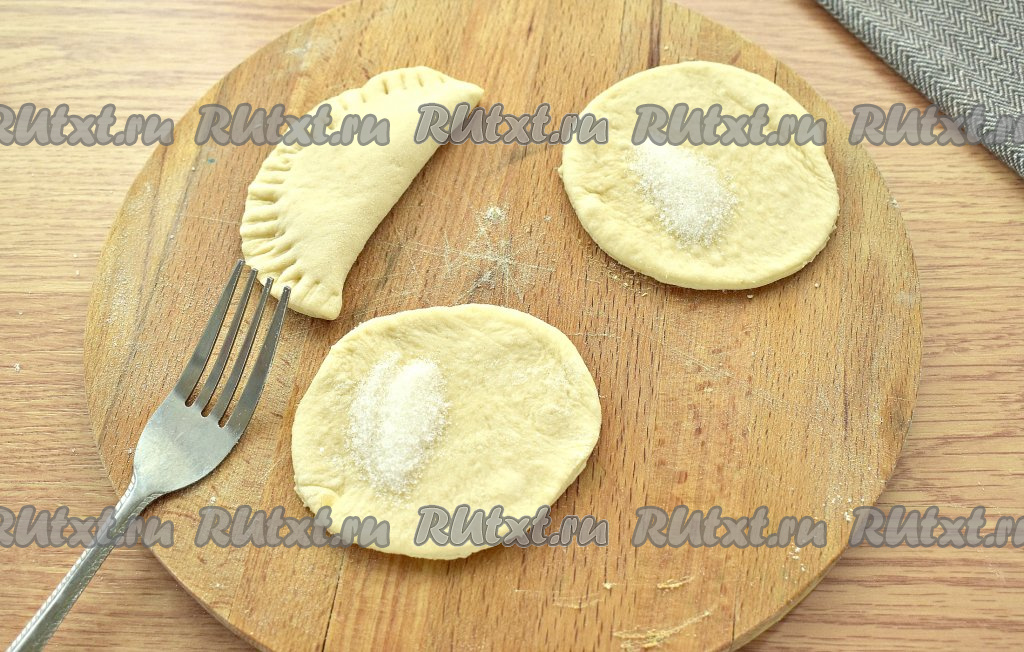 На каждую заготовку кладём немного (по вкусу) сахара. Складываем круглые заготовки пополам, формируя подобие чебурека, скрепляя края и прижимая их вилкой, как на фото. Таким же способом формируем пышки из оставшегося теста. У меня получилось 15 штук.