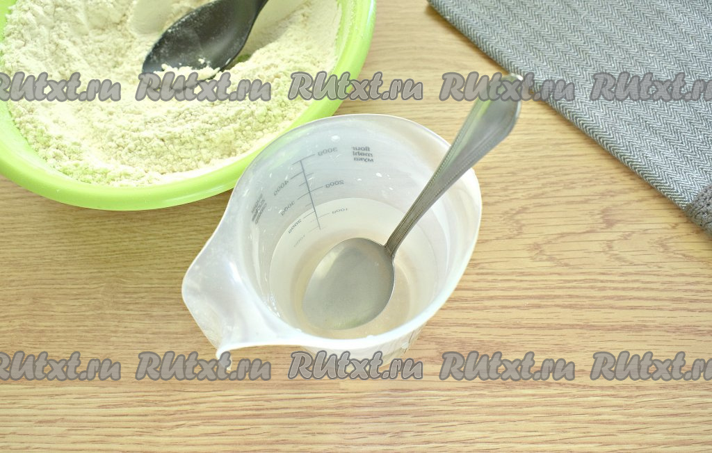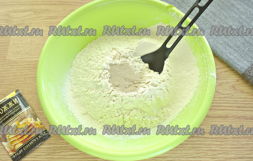 Примерно, 300 грамм пшеничной муки просеиваем в широкую миску. Всыпаем к муке сухие быстродействующие дрожжи.