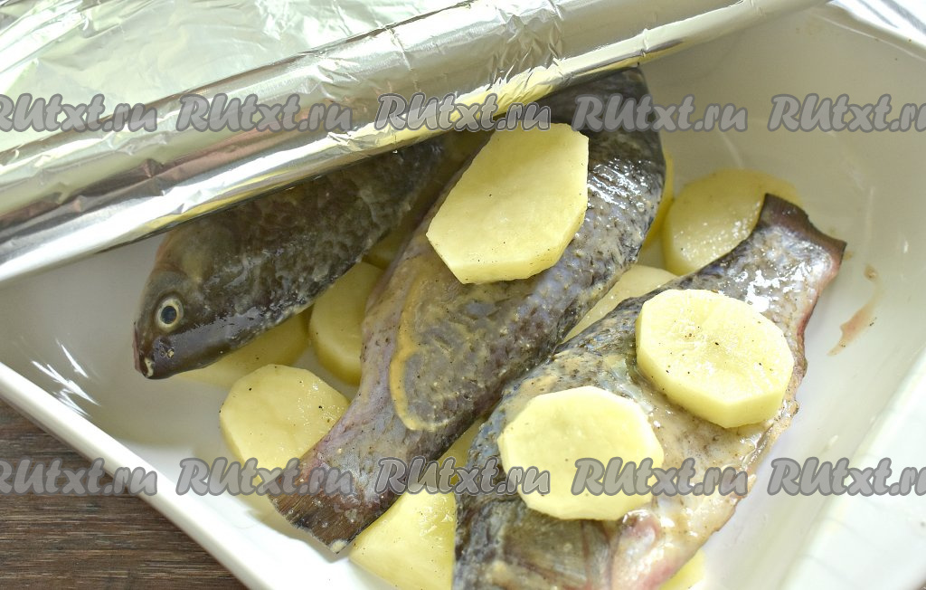 На карасей помещаем по кружочку картошки. Форму с карасями и картофелем закрываем фольгой. Благодаря картошке, которая находится поверх карасиков, фольга не будет соприкасаться с рыбой и караси не прилипнут к фольге при запекании.