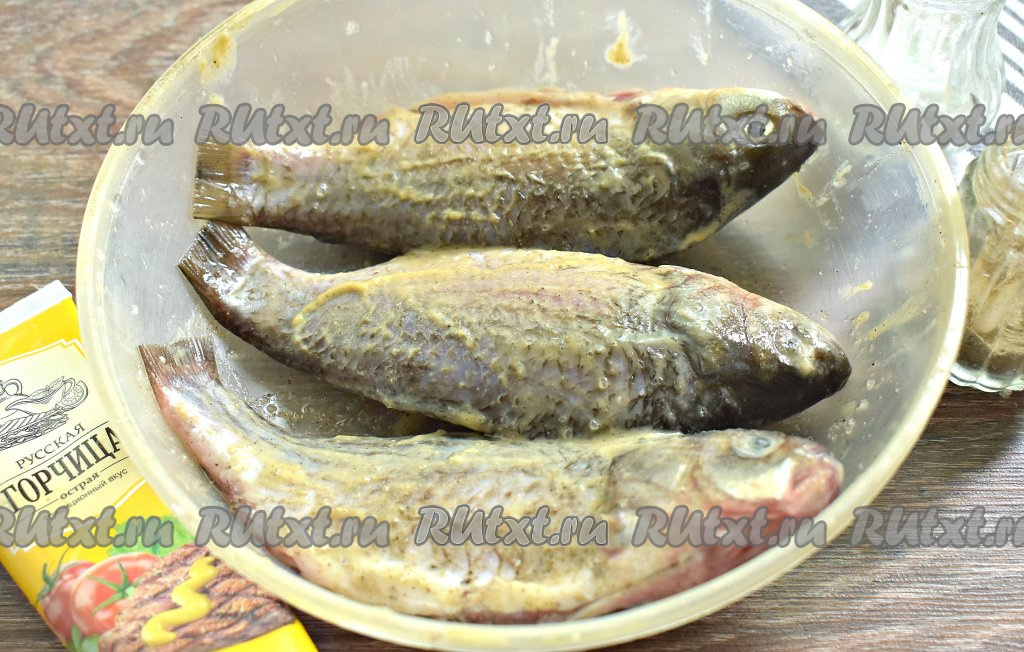Карасей внутри и снаружи натираем по вкусу солью и молотым чёрным перцем. Хорошо обмазываем горчицей (или майонезом, или сметаной). Оставляем карасей мариноваться минут на 20.