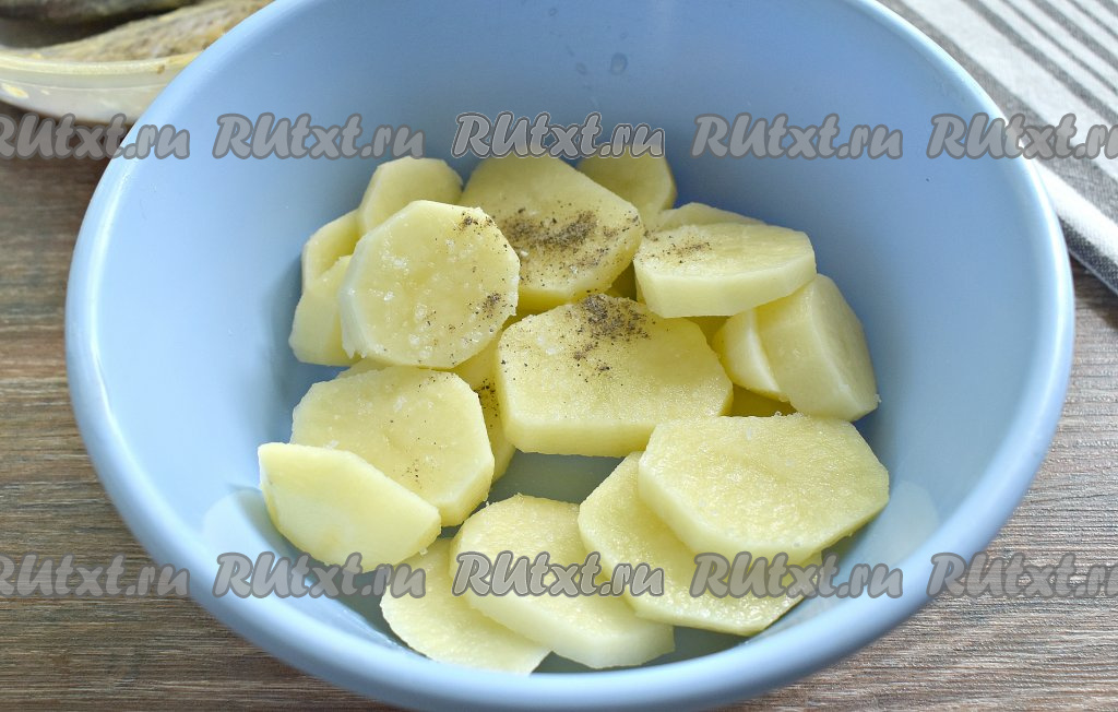 Нарезаем картошку на кружочки толщиной, приблизительно, 7 миллиметров, затем присаливаем, перчим и перемешиваем.
