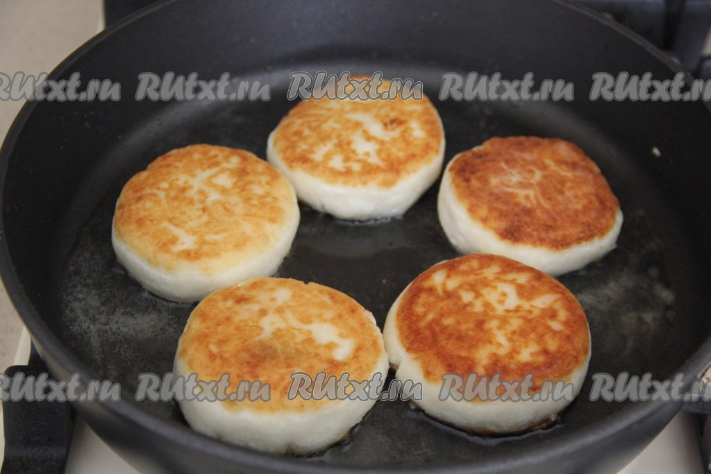 В сковороду влить растительное масло и хорошо разогреть. Выложить сырники. Жарить на среднем огне до золотистого цвета с двух сторон (примерно, по 3 минуты с каждой стороны). Затем огонь выключить, накрыть сковороду крышкой и дать сырничкам пропариться 3-5 минут.