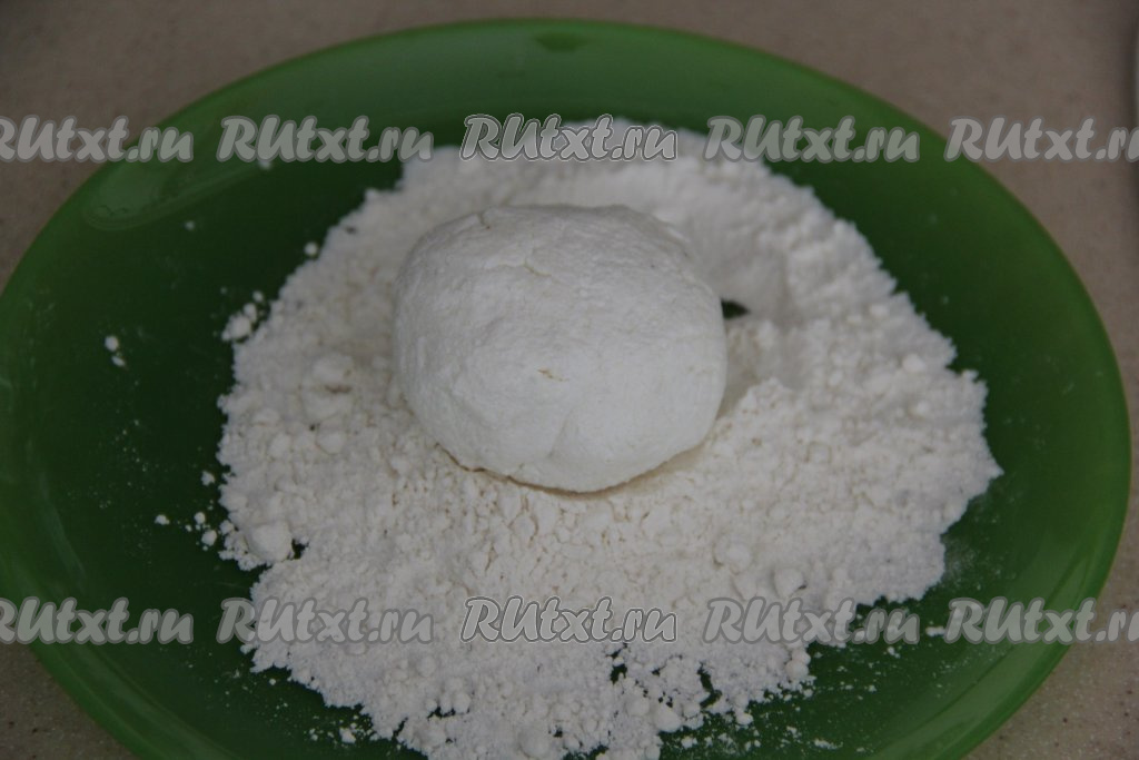 Ещё раз перемешать массу. Ориентируйтесь на консистенцию массы для сырников - она должна быть достаточно плотной, пластичной и не разваливаться, когда из неё будете формировать лепёшки. Творог выбирайте достаточно сухой, если всё-таки у вас творог влажноват, то добавьте чуть больше манки. Разделить получившуюся массу на 5 равных частей.