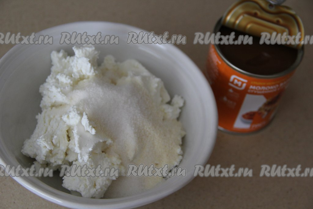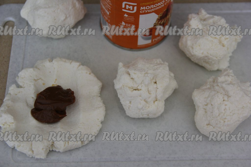 Из каждой части творожной массы сформировать лепёшку и выложить в центр по 1 чайной ложке варёной сгущёнки.