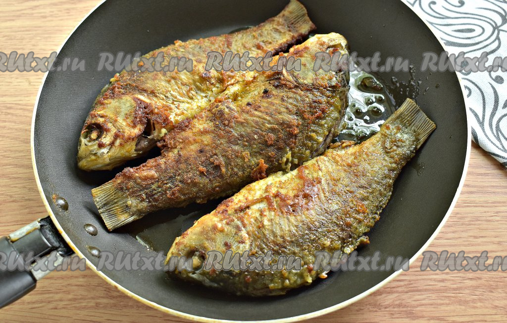 На сковороде разогреваем растительное масло. На достаточно сильном огне жарим карасей 3 минуты. Переворачиваем рыбку и продолжаем жарить ещё 3 минуты. Карасики должны покрыться золотистой корочкой.