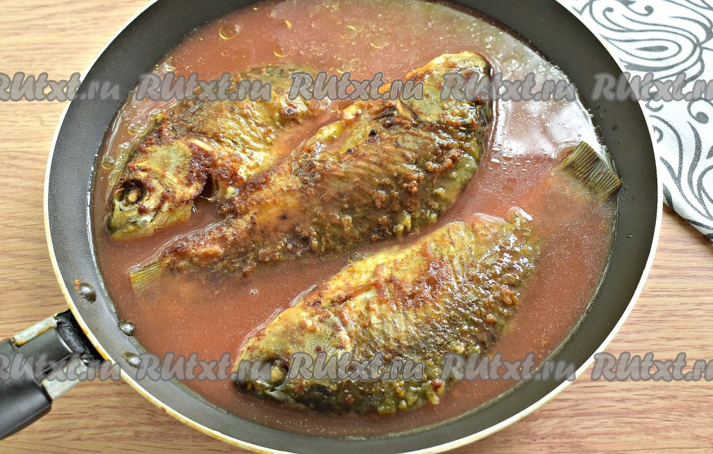 Убавляем нагрев плиты до минимального, сковороду накрываем крышкой. Тушим карасей в томатном соусе 10 минут.
