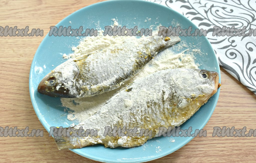На тарелку насыпаем муку. Обваливаем карасей с каждой стороны в муке.
