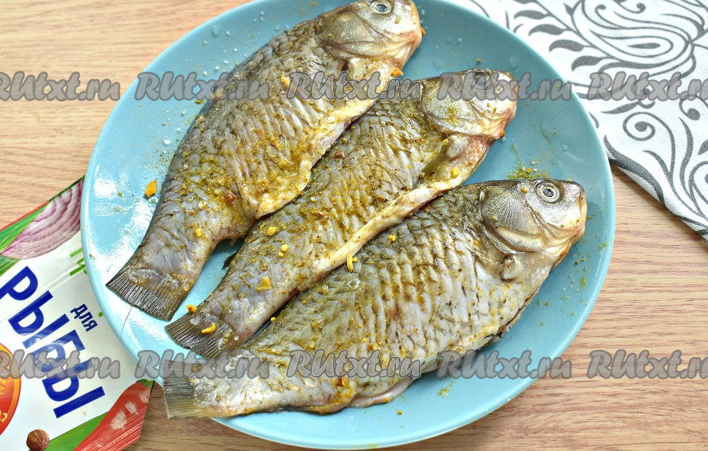 Натираем карасей со всех сторон солью, приправой для рыбы и молотым чёрным перцем.