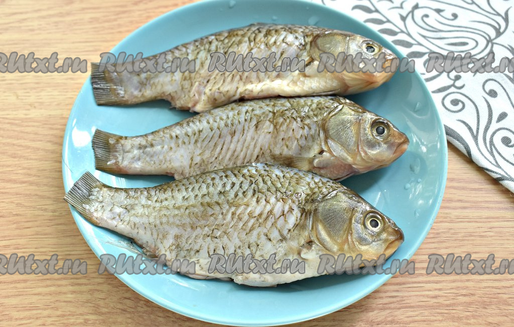 Свежих карасей чистим от чешуи. Срезаем хвосты, плавники. Из брюшка удаляем внутренности вместе с чёрной плёночкой, ведь она горчит.