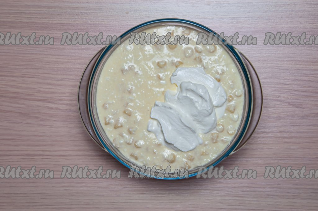 Смажьте сливочным маслом форму для запекания. Выложите туда творожно-макаронную смесь. Поверхность запеканки смажьте сметаной и разровняйте лопаткой.