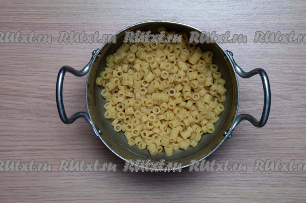 Вскипятите 1 литр воды, посолите по вкусу. Засыпьте макароны. Варите, помешивая, 5 минут с момента закипания на огне чуть ниже среднего (до полуготовности), затем слейте воду, дайте немного остыть.