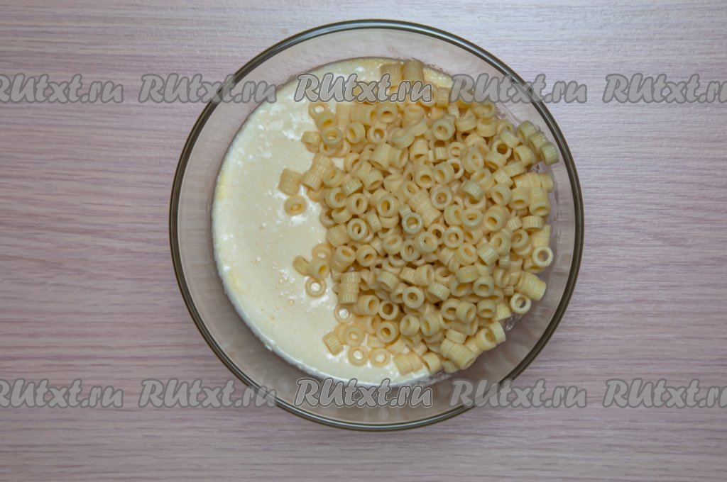Положите в творожно-яичную смесь отваренные макароны, перемешайте.