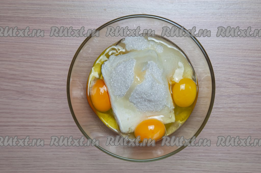 Положите в глубокую миску яйца, сахар, творог и ванилин.