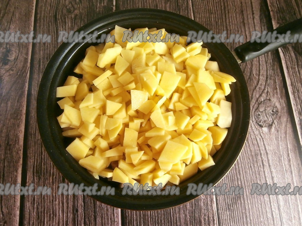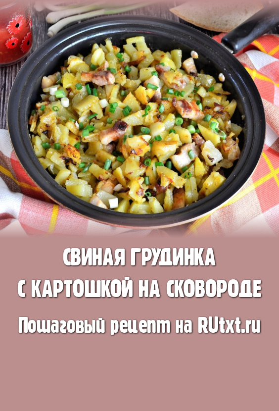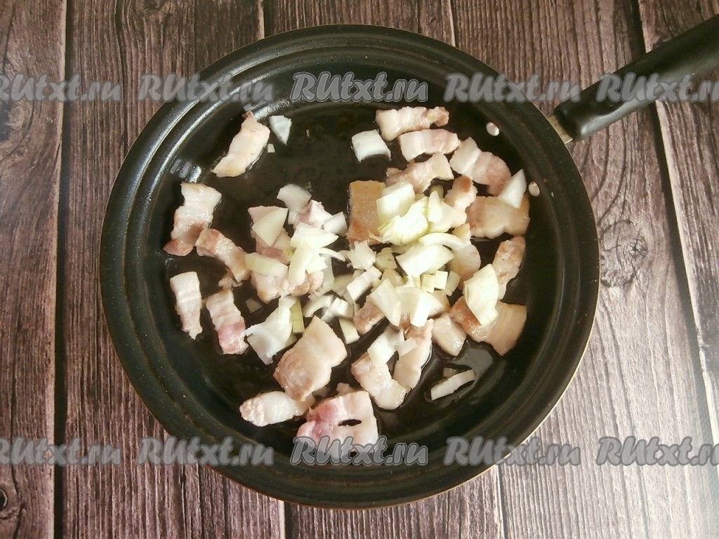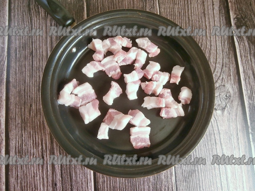 Картофель и лук очистить. Нарезать картошку на небольшие кусочки. Свиную грудинку тоже нарезать на небольшие кусочки, затем поместить в сковороду.